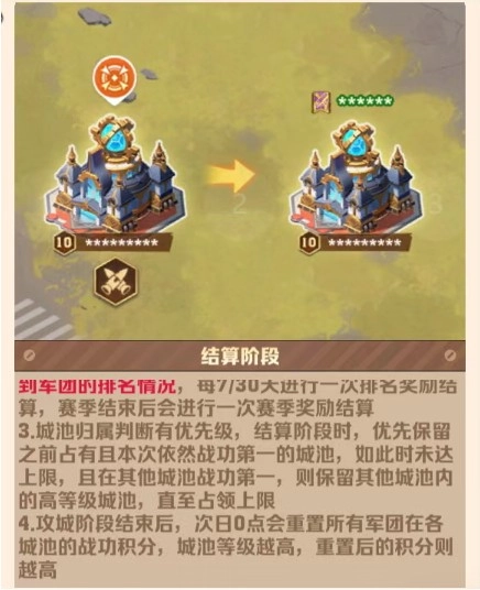 城池每日重置积分,积分高的军团获得归属权。若无其他军团挑战,则归属上一次攻城第一的军团;若有挑战,则按重置后的积分重新判定。
