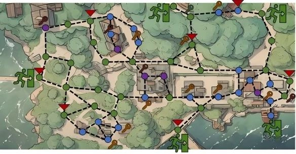 庄园路线图,三角形为玩家及AI复活点。