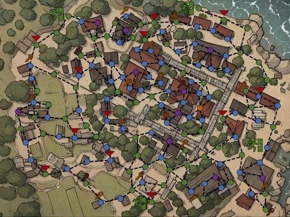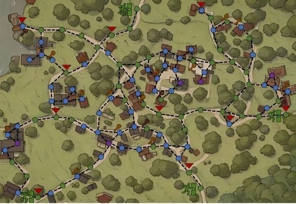 村庄路线图,三角形为玩家及AI复活点。