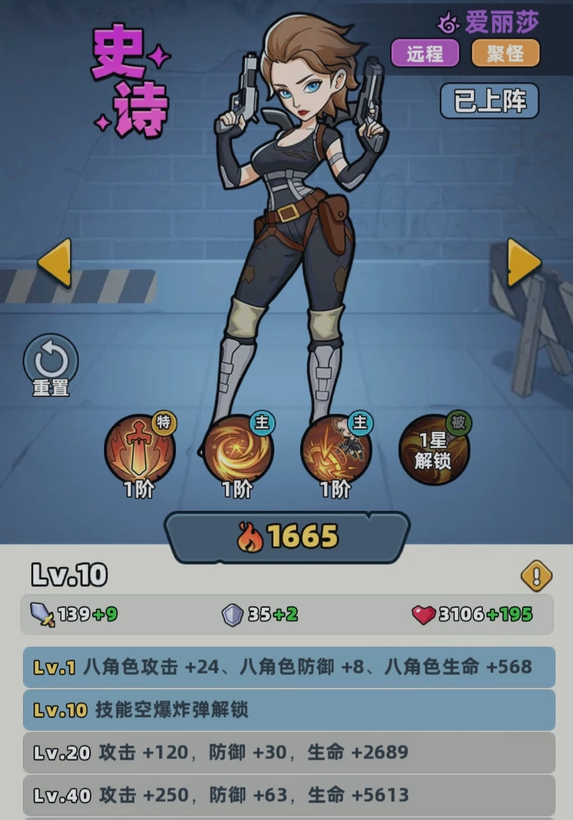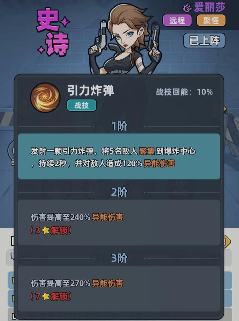 爱丽莎是一名主打远距离作战的辅助角色,对玩家而言,她的聚怪、控制能力表现扎实,随着等级提升,攻击、防御与生命属性会逐步增长。在1级时,她就能为全队提供攻击、防御和生命的基础加成;当等级达到10级解锁空爆炸弹后,其技能体系的强度会显著提升——该技能不仅能对范围内多个目标造成伤害,还能对已被聚怪的敌人追加额外伤害。正是这些技能形成了完整的闭环,让她得以给队伍创造更优质的输出环境。