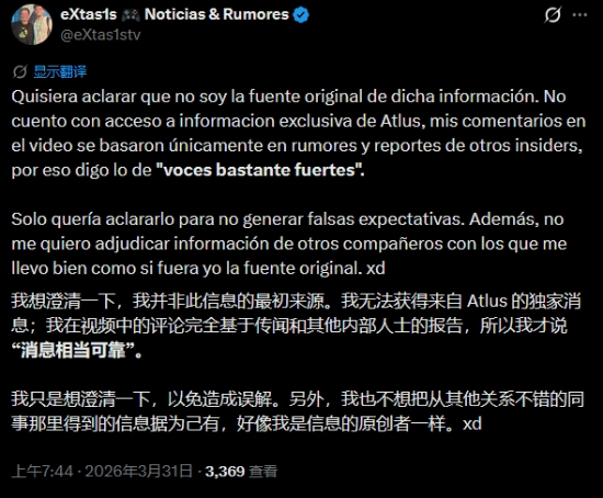 不过随后,他又发文强调,他并非这条消息的原始来源,他也没有来自Atlus的独家情报,其在视频中的说法也只是基于其他爆料者的传闻和报告。因此建议大家理性看待。