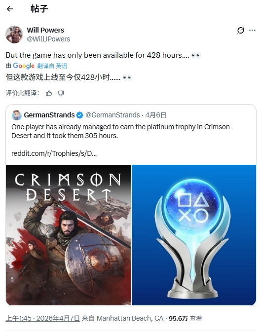 他估计,如果参考攻略,其他玩家可能只需约一半时间就能达成白金。但即便如此,他在305小时的游戏后仍未看完《红色沙漠》的全部内容:“还有超过100种生物、14个BOSS和数百个任务等着我呢,白金之后也还有!”