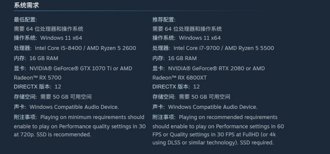 而推荐配置方面,官方给出了32GB内存以及RTX 3070Ti或Radeon RX 6800XT,这个配置依旧不低,而且官方在给出配置时也没有说明目标分辨率和帧数,以及是否需要开启DLSS。