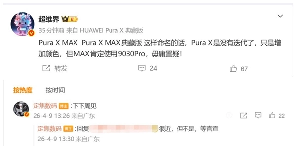 需要注意的是,尽管之前有消息称发布日期定在4月21日,但最新信息显示实际发布时间并非这一天。作为主要的升级之处,Pura X Max的处理器从Pura X所搭载的麒麟9020提升到了麒麟9030 Pro,而这也是华为目前性能最强大的手机芯片。