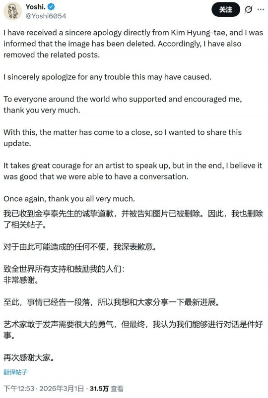3月1日,Yoshi发布日英韩三语声明,表示已收到金亨泰“直接且诚恳的道歉”,对方也确认已删除该AI图像。Yoshi随即移除自己相关指控贴文,并向全球支持者致谢:“发声需要很大勇气,但最终能对话是好事,这件事就此结束。”