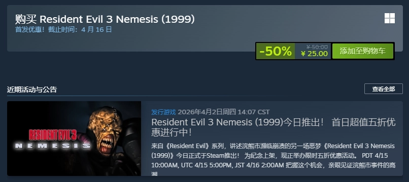 玩家纷纷吐槽:Steam平台上《生化危机3》原版售价竟高于重制版