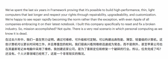 Patel在文中回顾了Framework过去六年的探索,印证了兼具高性能、轻薄特性且支持维修与升级的笔记本具备实现可能,同时提出维修正从特殊情况转向普遍现象,“就连苹果也在其最新款笔记本中顺应了这一潮流”。