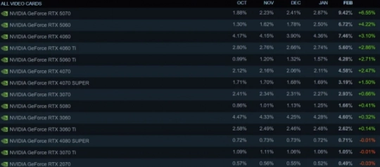 数据显示,RTX 5070的市场份额在1月为2.87%,到2月已飙升至9.42%,单月增长率达到228%,这一变动幅度创下了Steam硬件调查的历史纪录。需要指出的是,该增长并非由RTX 4060的份额下滑导致,而是RTX 5070自身实现了爆发式的市场普及。
