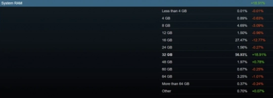 系统内存配置方面也出现了一个显著变化。数据表明,32GB内存占比达到56.93%,首次成为Steam玩家最主流的内存容量,相比上月增长了18.91%。而此前长期占据主导地位的16GB内存,其份额则从接近40%下降到了27.47%。