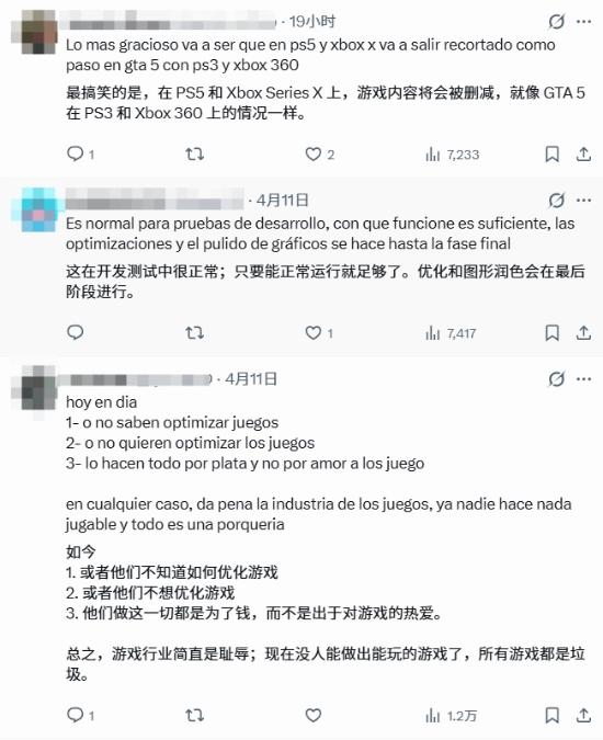 当前的测试版本被普遍认为是早期的 Alpha / 开发中版本,并非最终成品。大量网友借此吐槽 R 星存在 “摆烂” 嫌疑:要么是真的不会优化游戏,要么是为了圈钱根本不想好好优化。还有玩家联想到了当年《三男一狗》在 PS3 上的糟糕表现,担心这种 “半成品” 状态会延续到下一代主机和 PC 平台。