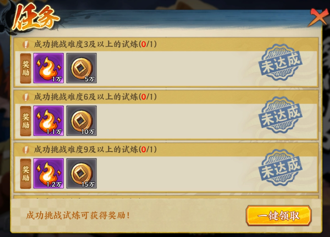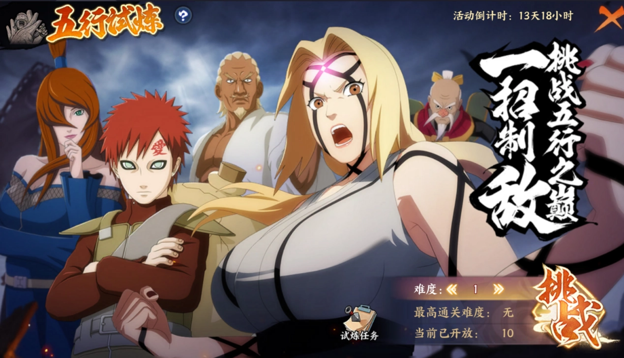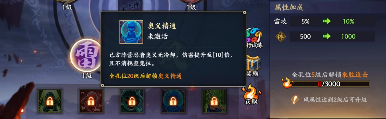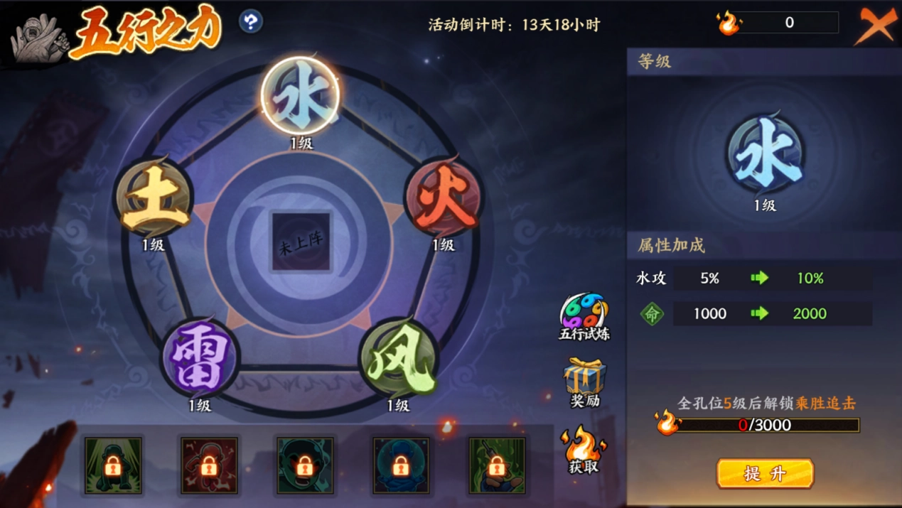 5、五行试炼里主要是获取五行查克拉和铜币奖励,用于提升五行之力等级。