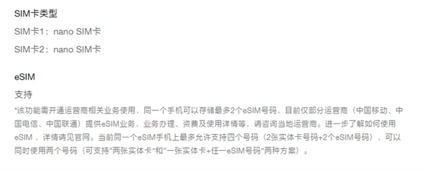华为表示,同一个手机可以存储最多2个eSIM号码,目前仅部分运营商(中国移动、中国电信、中国联通)提供eSIM业务,业务办理、资费及使用详情等。