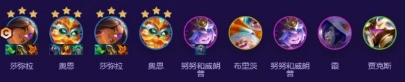 2、一般情况下,3-5阶段上七级启动;要是血量保护得当,也可以等到4-1阶段再升七然后D牌。保持好利息,慢慢追三星萨弥拉和奥恩。这套阵容里的萨弥拉基本没什么人抢,很容易三星。比较关键的是努努,堪称萨弥拉伤害的发动机,必须上两个。七级时上2个努努、奥恩、萨弥拉和一个狗头,八人口补霞,九人口再上武器大师。