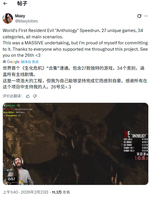 Maxylobes是一位经验丰富的速通玩家,同时也是恐怖游戏爱好者,他此前已在多个项目中创造过纪录。随着《生化危机9:安魂曲》正式上线,外界预计他未来也有望参与该作的速通竞争。