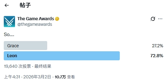 近日,TGA官方账号在社交媒体X平台发起了一项投票活动,让玩家从《生化危机9:安魂曲》的两位主角里昂·S·肯尼迪和格蕾丝·阿什克罗夫特中进行选择。到目前为止,这项投票已经收到了超过1.96万份玩家反馈,最终结果十分明显:里昂以72.8%的得票率遥遥领先,格蕾丝则获得了27.2%的选票。