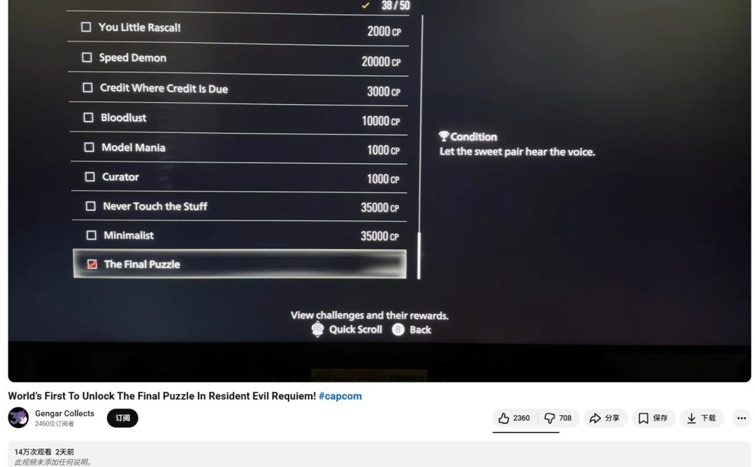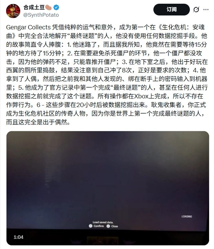 近日,《生化危机:安魂曲》里那个难住不少玩家的“最终谜题”,在玩家社区的集体努力下总算被解开了。不过在大家都在费尽心思琢磨解题方法的时候,有位玩家早就靠着运气拿到了这个成就,他自己甚至都搞不清楚是怎么获得的。