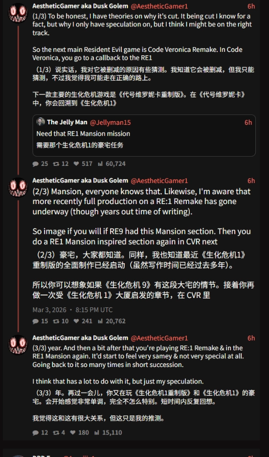 据悉,他此前曾有过与《生化危机1重制版》相关的不同爆料,此次最新爆料与过往说法有一定的差异,也进一步引发玩家对项目真实性的讨论。