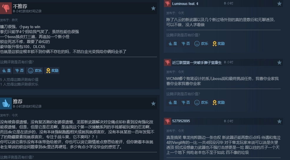 也有玩家对角色设计与战斗表现提出批评。有评论提到,新武器和招式的数量偏少,部分玩家觉得角色招式设计缺乏变化,打击感表现不如系列以往作品,所以整体体验没能达到预期。
