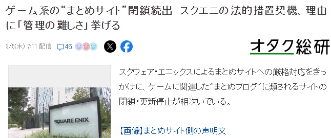 尽管SE法务部不像任天堂法务部那样广为人知,但他们针对日本游戏自媒体速报站的一起诉讼案件却引发了意外的连锁反应——已有多家未涉事的速报站宣布自行关闭,原因很简单:“审核管理实在太难了”。