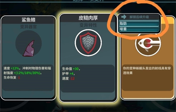 5、最后是解锁增重,增重需要先解锁皮糙肉厚,这样能让你的护甲更高、更耐打。局内加点体型成长时,前期如果回血足够就点辐射强度,后期要是实在拿不到前面提到的天赋,点一些体力也可以。