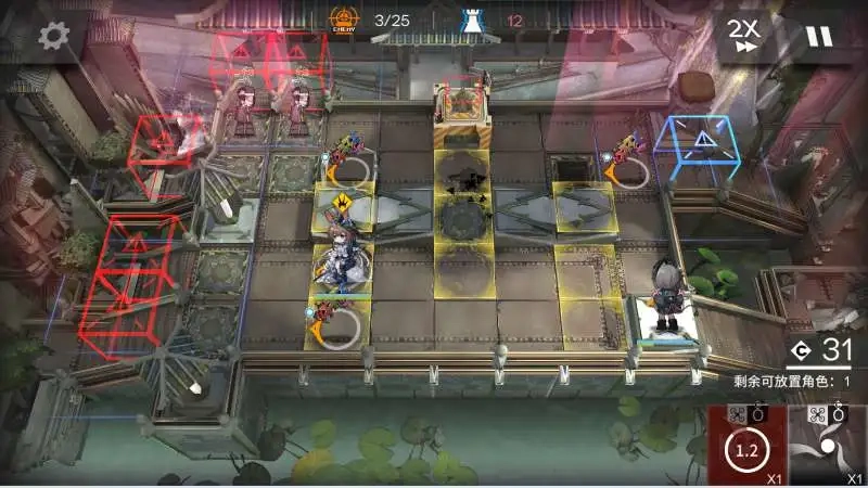 精二电弧可单人无漏过,精一则先下豆苗在下面一排高台左边朝右部署召唤物阻挡,电弧在右边朝左。清完小怪撤豆苗,留阿咬在蓝门右边第二格部署电弧召唤物卡怪,再部署豆苗到雕伥附近高台打雕伥。