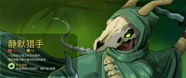 2、静默猎手:定位是敏捷型刺客,灵活输出,前作经典的毒流、小刀流全面重做,新增大量过牌和爆发卡牌,优化循环逻辑,爽感拉满,适合喜欢灵活操作、追求持续输出的玩家。尤其是小刀流,在新的刀刃陷阱、刀扇加入之后,成型一波爆发能顶住的BOSS还真没几个。还有毒和弃牌体系强度也不弱,整体成型的强度在所有角色里面都是一线水准。推荐有一定基础的玩家游玩,主要是因为猎人的过渡成型萌新不一定把控的了,很容易倒在一层和二层。一层幽灵鳗鱼群和旧日雕像很容易把我们打废,二层精英有小刀流最怕的蜂群术士,后面还有冒充小怪的猎人杀手等着,给成型也上了难度。
