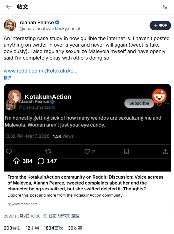 近日,游戏社群里出现了针对《派遣中心》中玛莱沃拉配音演员阿拉娜·皮尔斯的不实信息。一张伪造的推文截图称皮尔斯抱怨粉丝对角色进行性感化塑造,这引发了部分网友的讨论。皮尔斯已经通过社交平台Bluesky公开澄清,确认相关截图是伪造的。