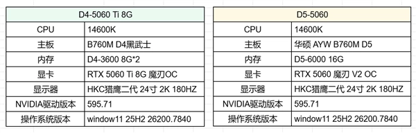 测试配置方面,配置一与配置二拥有相同预算,但配置一采用双根DDR4+RTX 5060 Ti 8G 魔刃OC的侧重显卡方案,配置二采用单根DDR5内存,但预算只够购入RTX 5060 魔刃V2 OC,整体侧重内存频率,测试的游戏包括了单机游戏与热门网游,画质方面优先使用高预设。