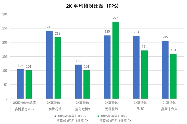 首先是2K画质下,赛博朋克2077开启光特效高光锥,DLSS启用性能档位,帧生成为2X,两套配置帧数上可以来到105帧左右,但在2K高特效下的三角洲行动中,双通道DDR4的优势还是显现出来了,配置一以更高的241帧获得领先,而最新的生化危机:安魂曲中,依旧是高性能显卡致胜,来到121帧,但在显卡需求不高的网游无畏契约中,配置二以272帧的优势拿下的胜利,不过在后续的PUBG以及燕云十六声中,都是配置一以高性能显卡的优势获得了胜利。