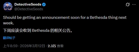 消息人士DetectiveSeeds称Bethesda可能下周就会发布相关公告。