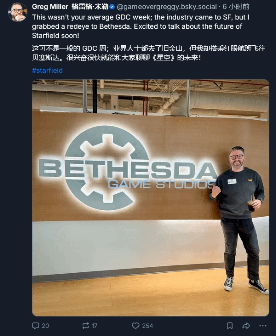 除此之外,前IGN编辑Greg Miller也在近日来到了Bethesda,他同样明确提到了《星空》。