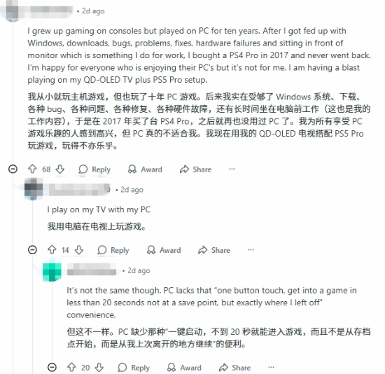 玩家称,因不堪Windows系统更新频繁、各类Bug频发、硬件故障不断,加上长时间面对显示器(与工作场景重合)的困扰,最终决定回到主机平台。