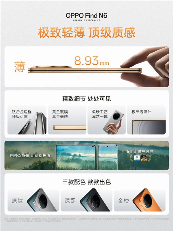 在拥有如此强悍配置的同时,OPPO Find N6的工业设计也达到了新高度。该机在折叠状态下的厚度仅为8.93毫米,真正实现了高性能与轻薄手感的完美平衡。
