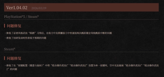 3月19日消息,Team Ninja旗下的硬核动作游戏大作《仁王3》(Nioh 3)今日已正式在PlayStation 5和Steam平台推送最新的Ver 1.04.02版本更新补丁。