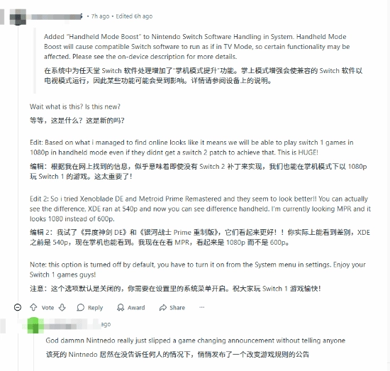 这次更新的低调发布引发了玩家们的热烈讨论:任天堂之前连蓝牙耳机功能都要特意发布官方公告,可这次却把被玩家称作“Switch 2推出以来最重要功能”的更新悄悄放在补丁里。有人调侃“任天堂的心思永远猜不准”,也有玩家表示“可以原谅任天堂了”,觉得这项功能让初代Switch的游戏库在新主机上重新焕发活力,大大提高了Switch 2的兼容性价值。
