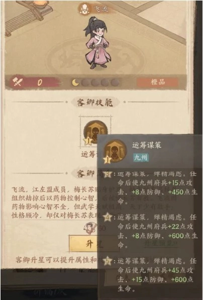 普通橙色客卿,适合梧桐苑未满的中氪玩家,高星可放一车提升整体战力,低星暂时放到梧桐苑可同时强化4辆戎车。