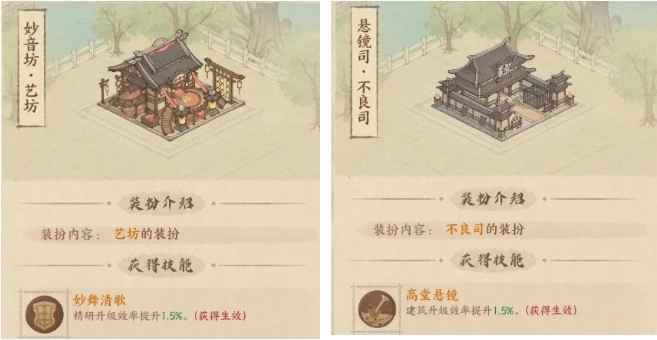 性价比很高的装扮,适合微中氪,二者集齐金陵谍阙套装,可激活观照万象,提升建筑效率3%。