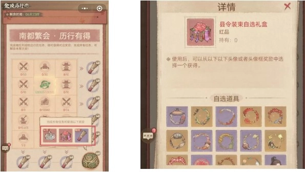 (1)微氪玩家(30r):获得17个祈宁香、限时一阶琅琊阁城皮(14天)、县令装束自选礼盒。与往期类似活动相比,这次额外新增了头像/头像框自选,整体的性价比还是不错的。