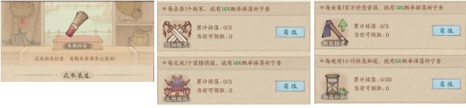 完成望楼、加速、采集、击杀叛军任务时概率掉落祈宁香。任务内容简单,和金陵历行活动任务有重叠,可一起完成。