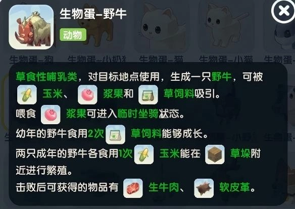 草食性哺乳类,对目标地点使用,生成一只野牛,可被玉米、浆果和草饲料吸引,喂食浆果可进入临时坐骑状态。