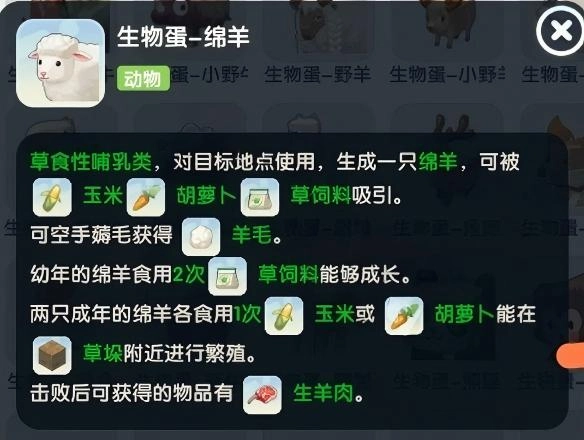 草食性哺乳类,对目标地点使用,生成一只绵羊,可被玉米、胡萝卜草饲料吸引。