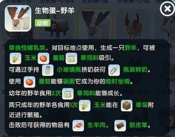 草食性哺乳类,对目标地点使用,生成一只野羊,可被玉米、番茄草饲料吸引。