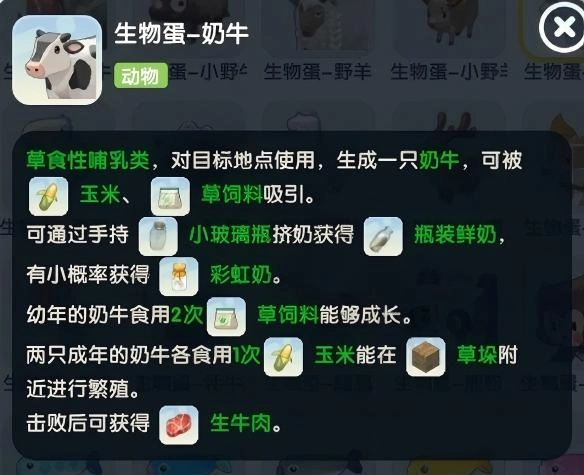 草食性哺乳类,对目标地点使用,生成一只奶牛,可被玉米、草饲料吸引。