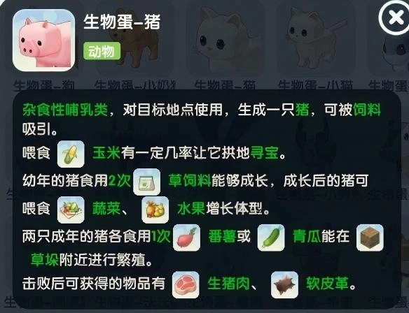 杂食性哺乳类,对目标地点使用,生成一只猪,可被饲料吸引,喂食玉米有一定几率让它拱地寻宝。