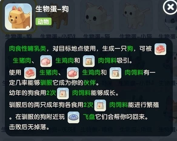 肉食性哺乳类,对目标地点使用,生成一只狗,可被生猪肉、生鸡肉和肉饲料吸引,使用生猪肉生鸡肉和肉饲料有一定几率能够驯服它成为你的伙伴。