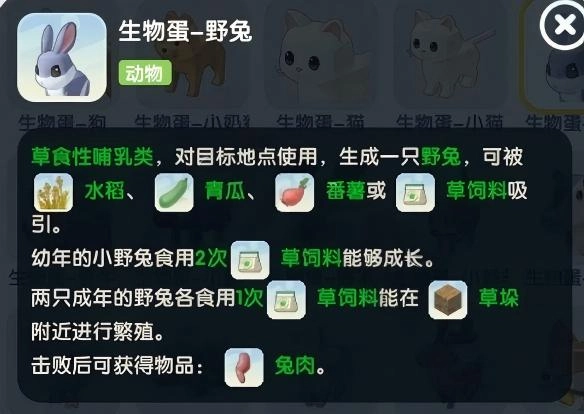 草食性哺乳类,对目标地点使用,生成一只野兔,可被水稻、青瓜、番薯或草饲料吸引。