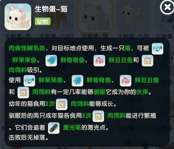 肉食性哺乳类,对目标地点使用,生成一只猫,可被鲜呆呆鱼,鲜奇奇鱼鲜丑丑鱼和肉饲料吸引。使用鲜呆呆鱼、鲜奇奇鱼、鲜丑丑鱼和肉饲料有一定几率能够驯服它成为你的伙伴。
