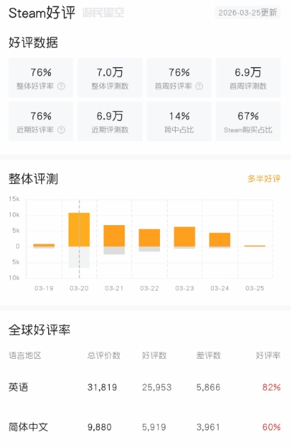 Steam全球整体好评率为76%,总评测数已突破7万份,显示出游戏在经历大更新后,口碑已进入稳定期。
