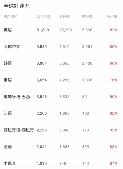 截至 3 月 25 日:简体中文总评价数已达到9880人,其中好评数为5919,差评数为 3961,好评率为60%。虽然对比发售初期有所提升,但仍低于全球平均水平。