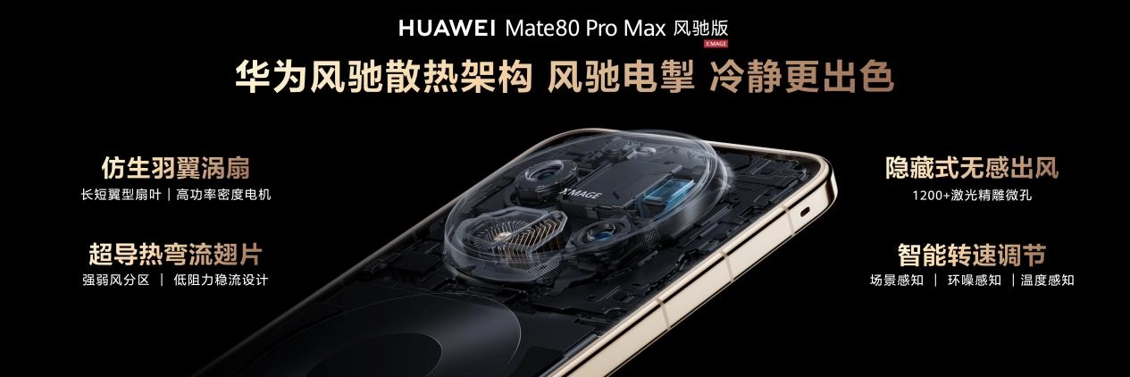 性能的上限,散热能力起着关键作用,华为Mate 80 Pro Max风驰版运用主动式风冷技术,大幅提高了散热上限。全新的仿生羽翼涡扇能提供充足风量,超导热弯流翅片可明显增加散热面积,再配合隐藏式无感出风设计,在确保散热效率的同时,也兼顾了握持时的舒适感。